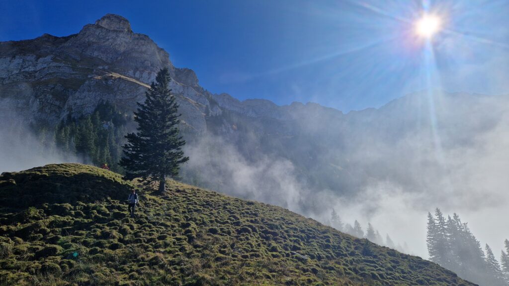 Eine tolle Tour heute. Sonne gesucht und schliesslich auch gefunden, also definitiv besser als der sonntägliche Kirchgang, obwohl man dort vielleicht noch Bekannte aus der Jugend getroffen hätte. Die Abfahrt ins Nebelmeer war dann allerdings wegen Feuchte extrem glitschig, das hätte wohl dem einen oder anderen RSV-Mitglied überhaupt nicht gepasst. So ziemlich mit Schlamm…